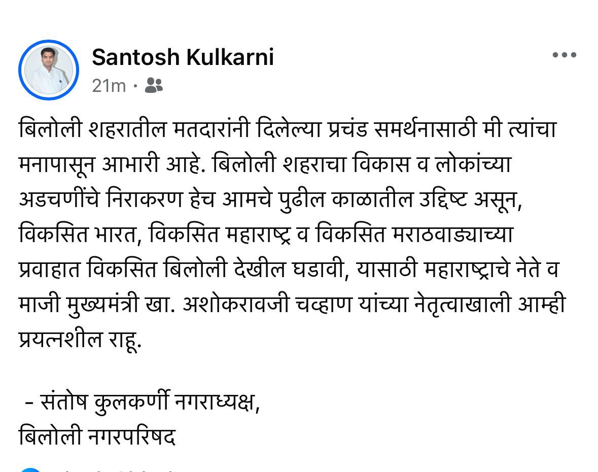 दरम्यान, बिलोली येथील मराठवाडा जनहित पार्टीचे नगराध्यक्ष पदाचे उमेदवार संतोष कुलकर्णी यांनी आगामी काळात आमची वाटचाल माजी मुख्यमंत्री अशोकराव चव्हाण यांच्या नेतृत्वाखाली होईल असे स्पष्ट केले आहे. आगामी काळात बिलोलीसह परिसराचा विकास करण्यासाठी भाजपाचे नेते अशोकराव चव्हाण यांच्याच नेतृत्वाखाली आपण काम करणार असल्याचे समाज माध्यमावरील एका संदेशाद्वारे स्पष्ट केले आहे. त्यामुळे आता बिलोली येथील मराठवाडा जनहित पार्टी ही भाजपाचाच भाग असल्याचे स्पष्ट झाले आहे. अल्पसंख्यांक मतांना आकर्षित करण्यासाठी मराठवाडा जनहित पार्टी उभी करण्यात आली होती, त्यात घवघवीत यश आले. आहे. त्याच धर्तीवर आता नांदेडमध्येही स्थानिक विकास आघाडी निश्चितपणे उभी करून भारतीय जनता पक्षाची वाटचाल महापालिका निवडणुकीत होणार असल्याचेही स्पष्ट होत आहे.