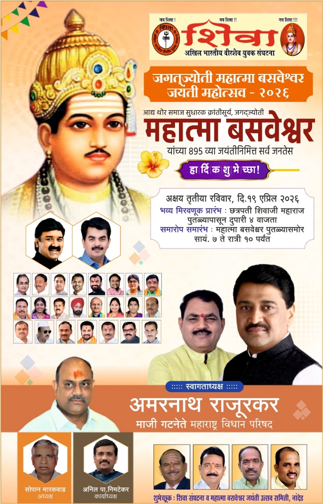 नांदेड – प्रतिवर्षाप्रमाणे अक्षय तृतीयेच्या दिवशी १९ एप्रिल रोजी क्रांतीसूर्य जगत्ज्योती महात्मा बसवेश्वर यांची जयंती शिवा अखिल भारतीय वीरशैव युवक संघटनेच्या वतीने मोठ्या जल्लोषात साजरी होणार आहे. नांदेड शहरात रविवारी निघणाऱ्या भव्य मिरवणुकीत नांदेड जिल्ह्यातील व शहरातील हजारो कार्यकर्ते व महात्मा बसवेश्वर प्रेमी सहभागी होणार आहेत, अशी माहिती स्वागताध्यक्ष, भाजपाचे महानगराध्यक्ष तथा माजी आ.अमरनाथ राजुरकर यांनी दिली.